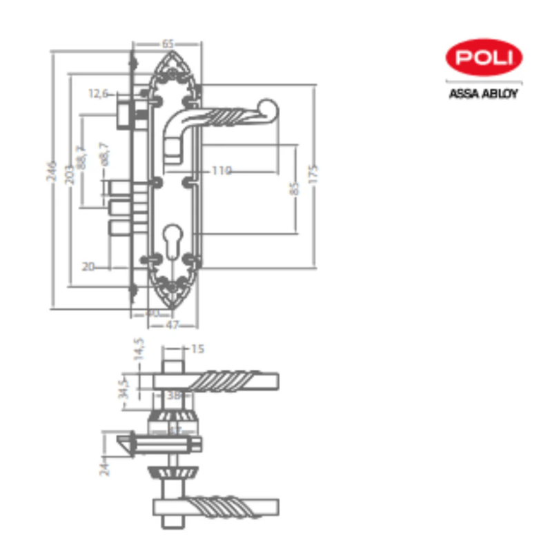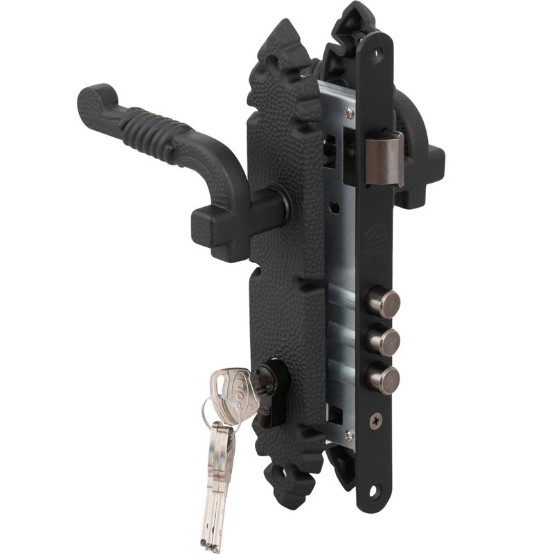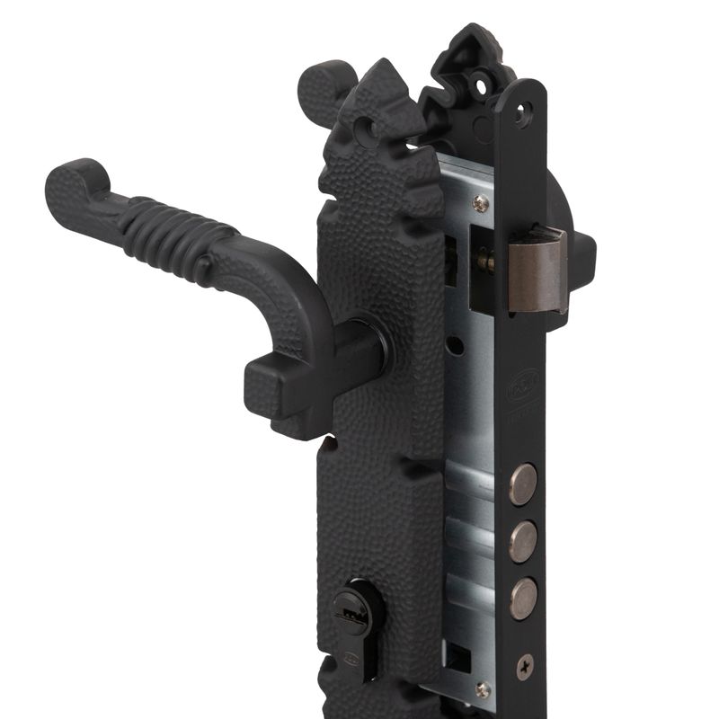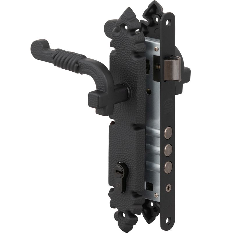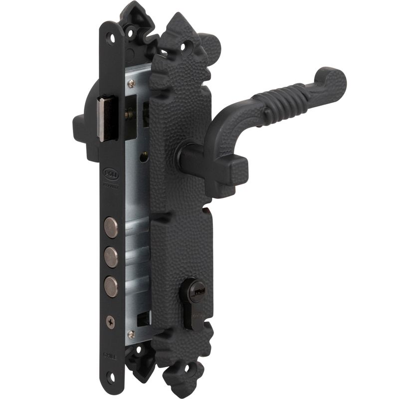Cerradura embutida de la línea Rústica, diseñada para puertas de oficina que requieren control de acceso mediante llave y una estética tradicional.