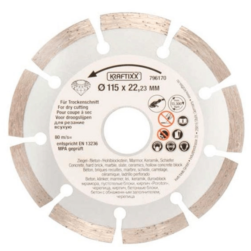 Disco diamantado segmentado KWB referencia 49796170, de 115 mm (4½″) de diámetro externo y orificio de 22 mm, con grosor de 7 mm. Diseño de borde segmentado tipo turbo que permite un corte rápido y eficiente sobre materiales duros como ladrillos, bloques de hormigón y clinker.