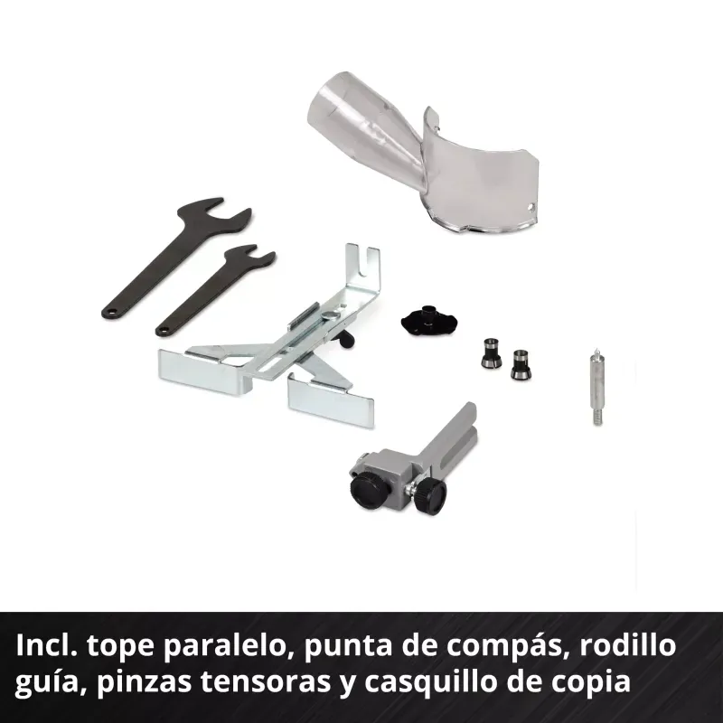 - Accesorios incluidos: tope paralelo, punta de compás, rodillo guía, casquillo copiador, adaptador de aspiración