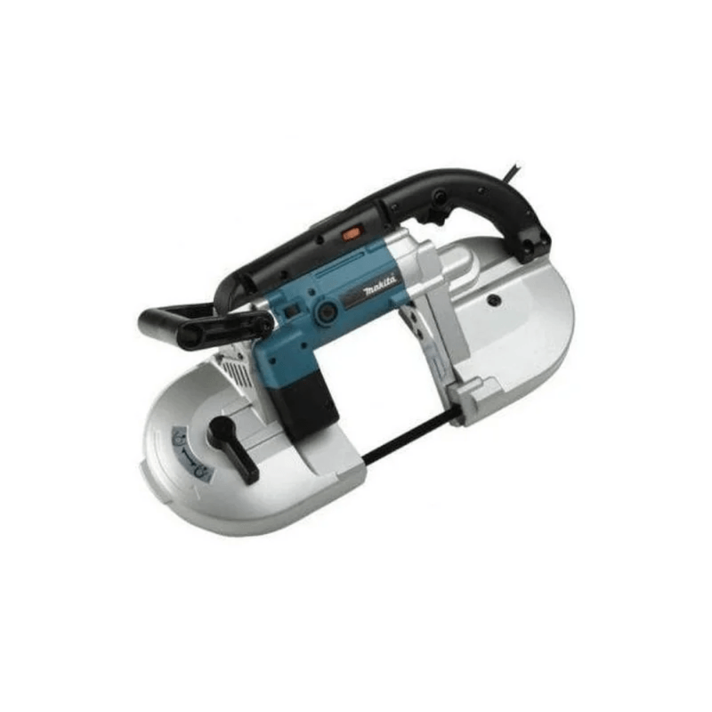 Sierra de banda portátil Makita modelo 2107FK de 710 W, con luz de trabajo integrada y velocidad variable, diseñada para cortes precisos en materiales metálicos de hasta 120 × 120 mm, con mango ergonómico y estructura resistente de aluminio.