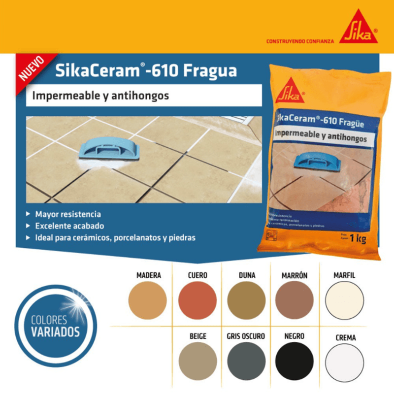 Este fragüe se mezcla con agua para formar una pasta fluida que se aplica fácilmente sin escurrirse en superficies verticales, permitiendo rellenar juntas de entre 1 y 10 mm. Su fórmula enriquecida con cemento, áridos selectos, polímeros y aditivos ofrece alta adherencia, impermeabilidad, resistencia al desgaste y protección contra hongos. Es apto para pisos y muros, limpia restos fácilmente tras una hora y alcanza resistencia completa al cabo de 24 horas, sin retracción.