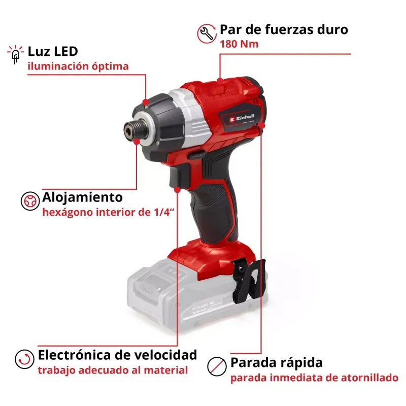Atornillador de impacto inalámbrico Einhell TE-CI 18 Li-Solo con motor Brushless PurePOWER, parte del sistema Power X-Change 18 V. Compacto y potente, ofrece alta capacidad de torsión y control de velocidad para tareas de fijación exigentes. Se entrega sin batería ni cargador.