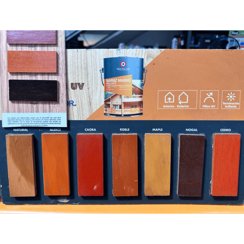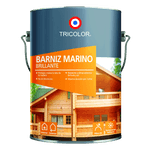 Barniz marino brillante Tricolor en tono roble, código 8721771101. Presentación en 1 galón, desarrollado para proteger y embellecer superficies de madera expuestas a la intemperie o en ambientes marinos. Su formulación con resinas alquídicas y filtro UV genera una película duradera, resistente y de excelente acabado brillante.