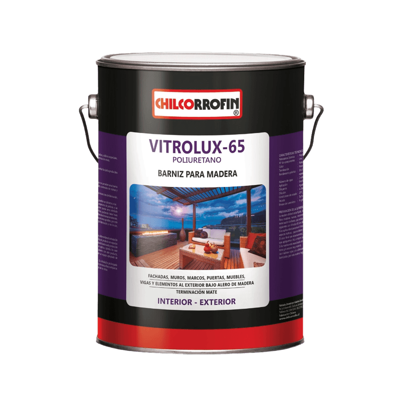 El Barniz Vitrolux 65 Natural Mate código 32521601 de Chilcorrofín es un recubrimiento transparente formulado en base a resinas alquídicas uretanizadas, diseñado para otorgar alta resistencia y un acabado mate natural. Su presentación en galón permite cubrir grandes superficies de madera, protegiéndolas de la humedad, la radiación UV y el desgaste, tanto en interiores como en exteriores.