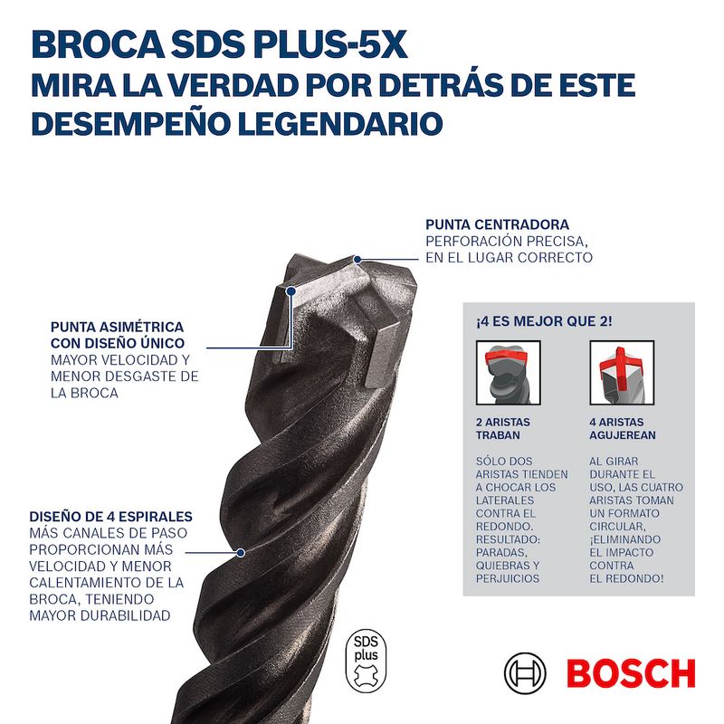 Broca profesional de la línea PRO SDS‑Plus 5X, ideal para trabajos exigentes en concreto y mampostería donde se requiere precisión y rendimiento prolongado.