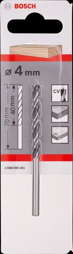 Broca Bosch cilíndrica para madera de 4 mm, con punta centradora (brad-point) y dos canales helicoidales, ideal para perforaciones limpias y precisas en madera dura, blanda y tableros laminados.