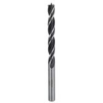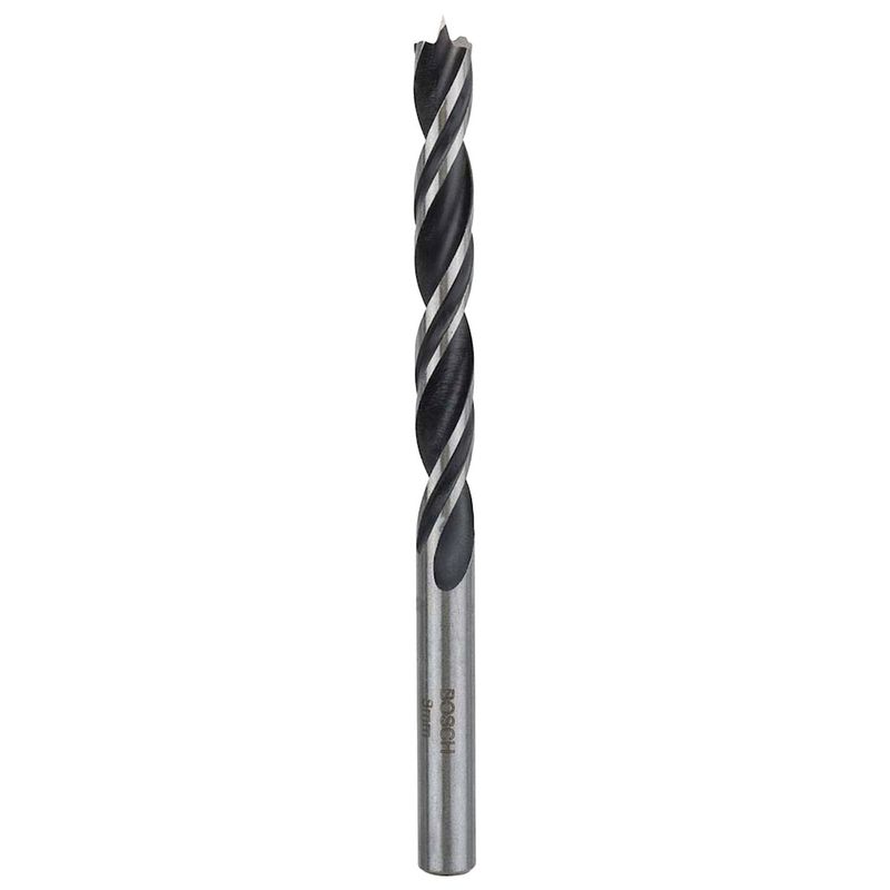 Broca Bosch cilíndrica para madera de 8 mm, con punta centradora (brad-point) y dos canales helicoidales, diseñada para perforaciones limpias y precisas en madera dura, blanda y tableros laminados.