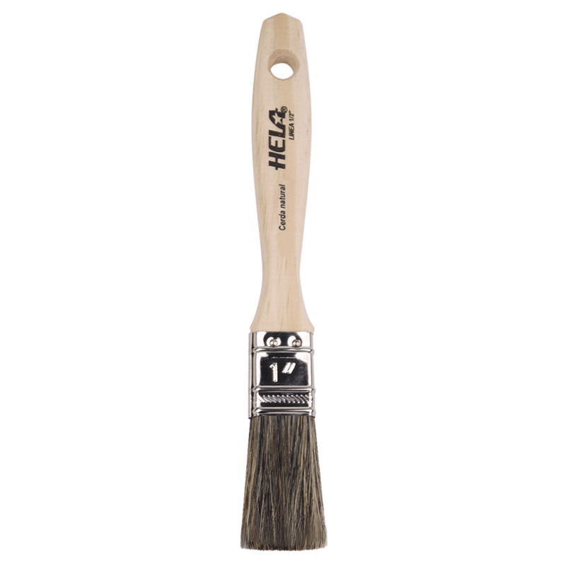 La brocha Hela Línea 1/2" de 1" corresponde a la gama alta y está diseñada para aplicaciones que requieren mayor retención de pintura y un acabado parejo. Su cerda gris de gran longitud y puntas desflocadas permiten una distribución uniforme en distintos tipos de superficies.