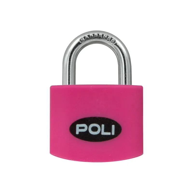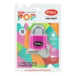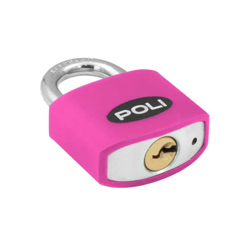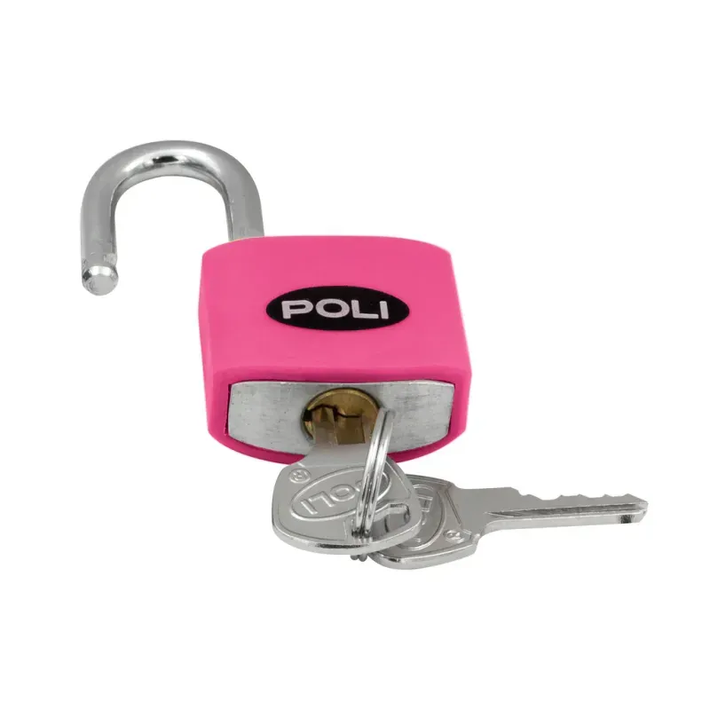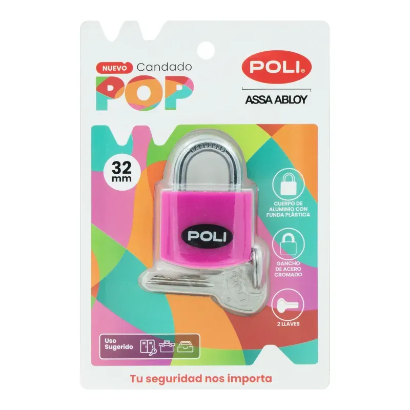 El candado POLI POP de 32 mm en color fucsia es una solución práctica y liviana para cierres de uso cotidiano. Su cuerpo de aluminio con funda plástica ofrece un manejo cómodo, mientras que su gancho de acero cromado y sistema de cierre con llave entregan seguridad básica para aplicaciones domésticas y escolares.
