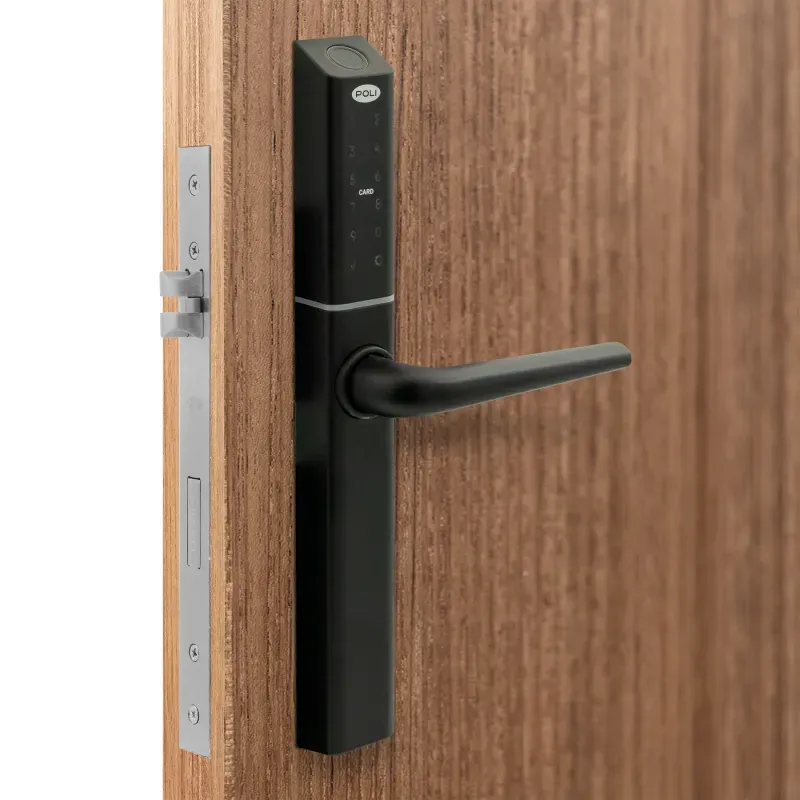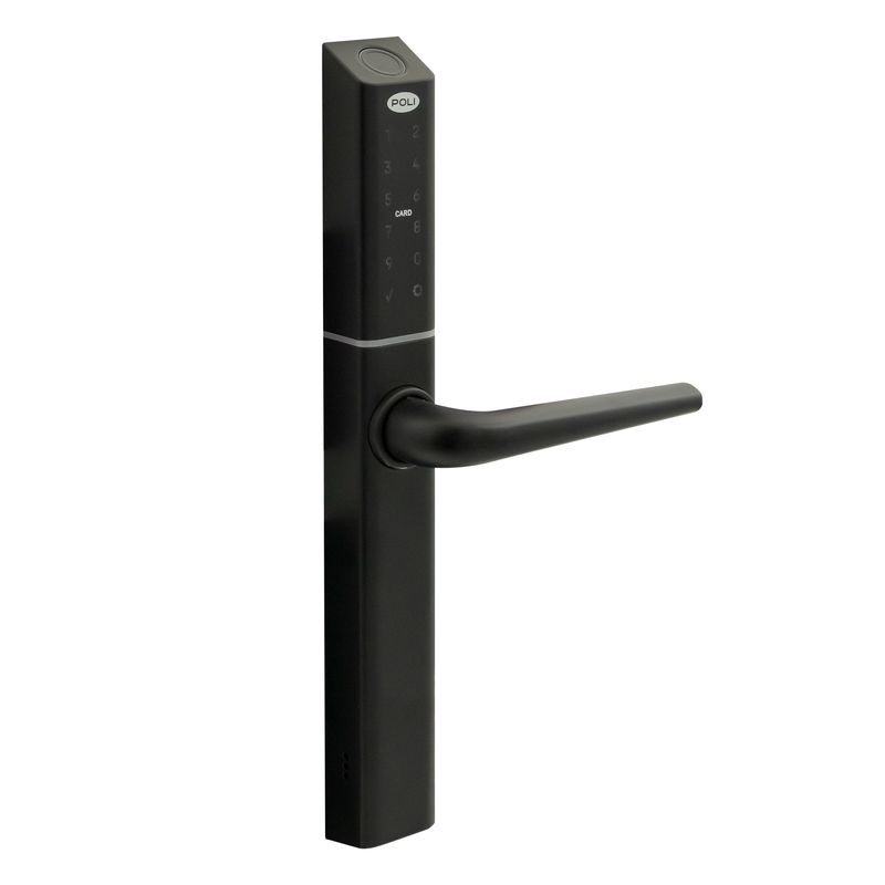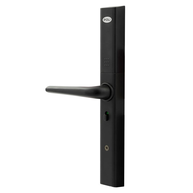 Cerradura digital inteligente Poli Smart 1300 en terminación negro, diseñada para puertas de acceso. Ofrece múltiples métodos de apertura y funciones avanzadas de seguridad y control.