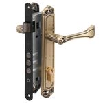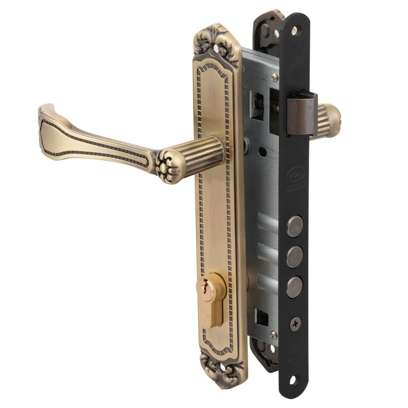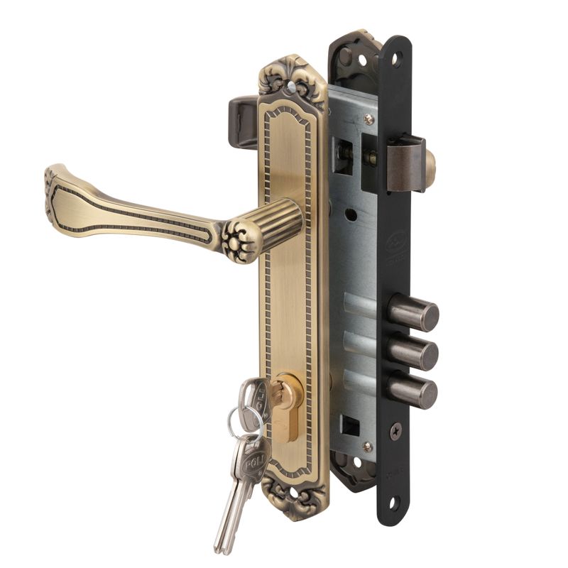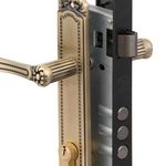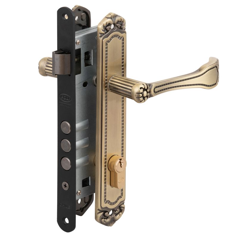 Cerradura embutida de la línea Barroca para puertas de oficina, con cierre mediante llave por ambos lados y mecanismo robusto para mayor seguridad.