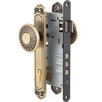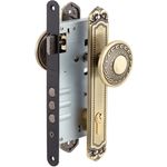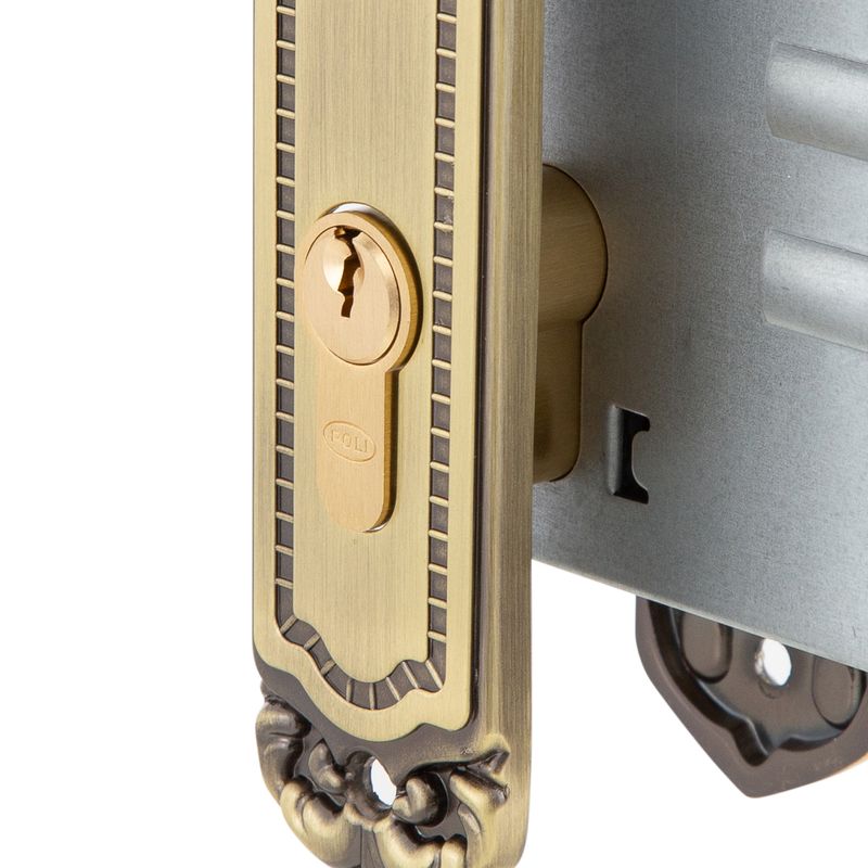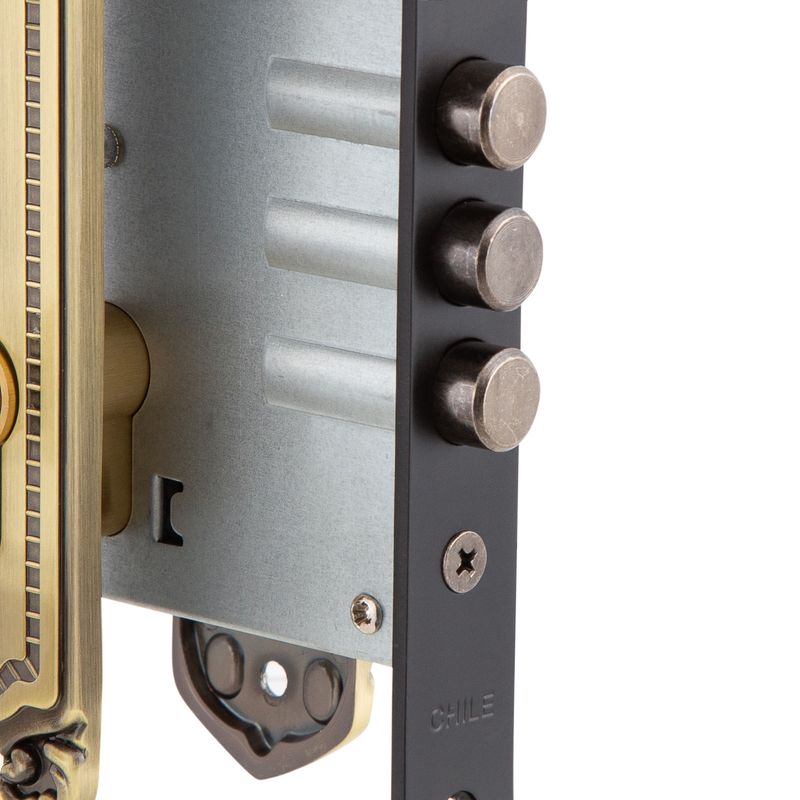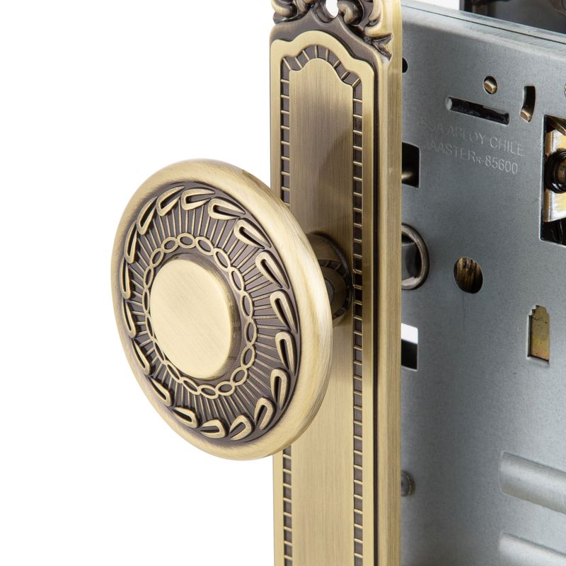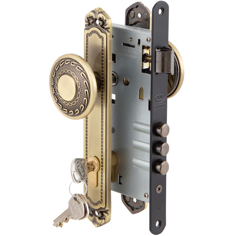 Cerradura embutida de acceso de la línea Barroca, diseñada para puertas principales que requieren un sistema de cierre robusto con pomo y llave tradicional.