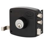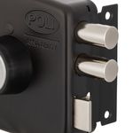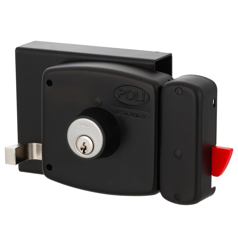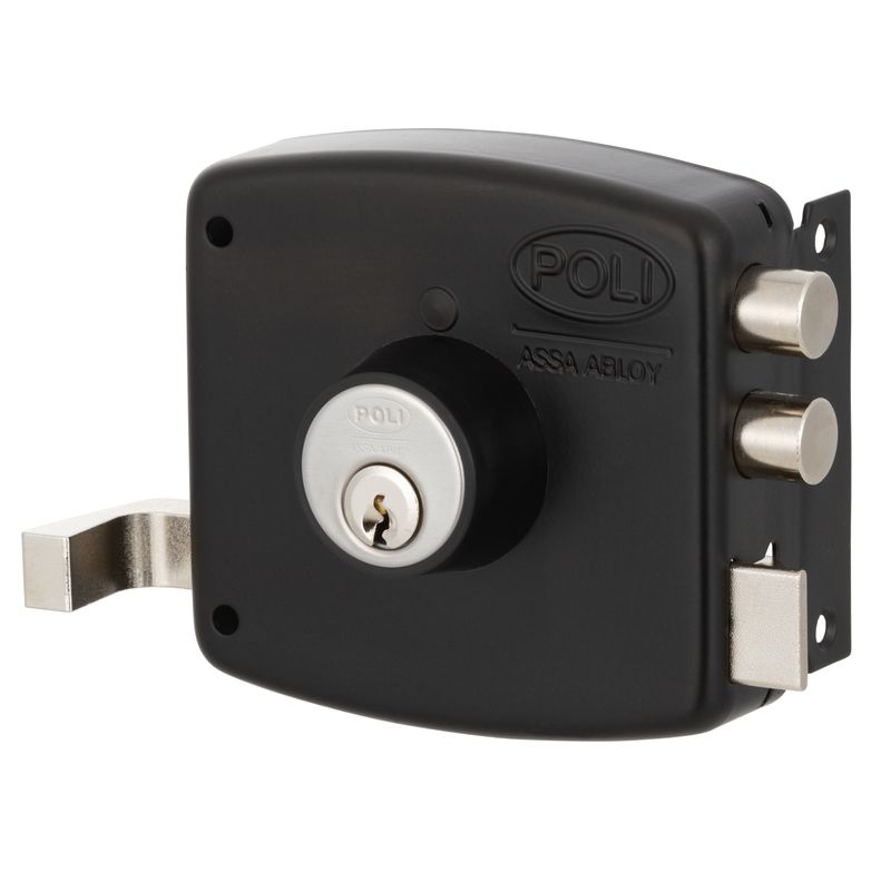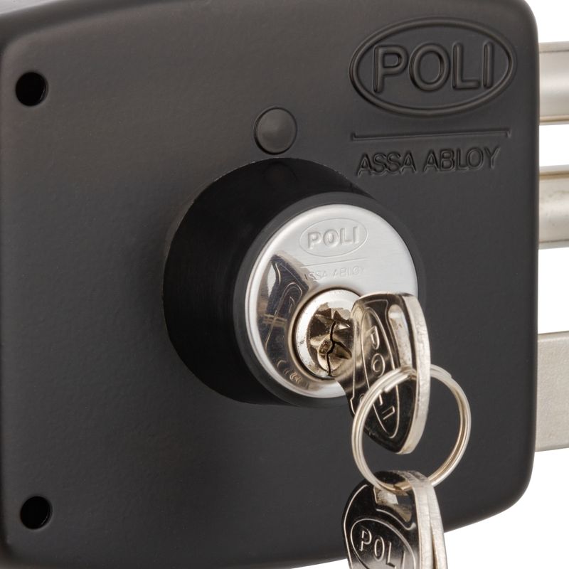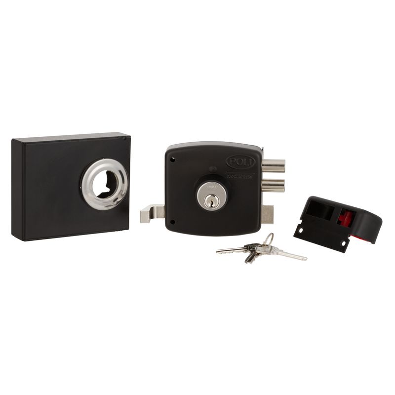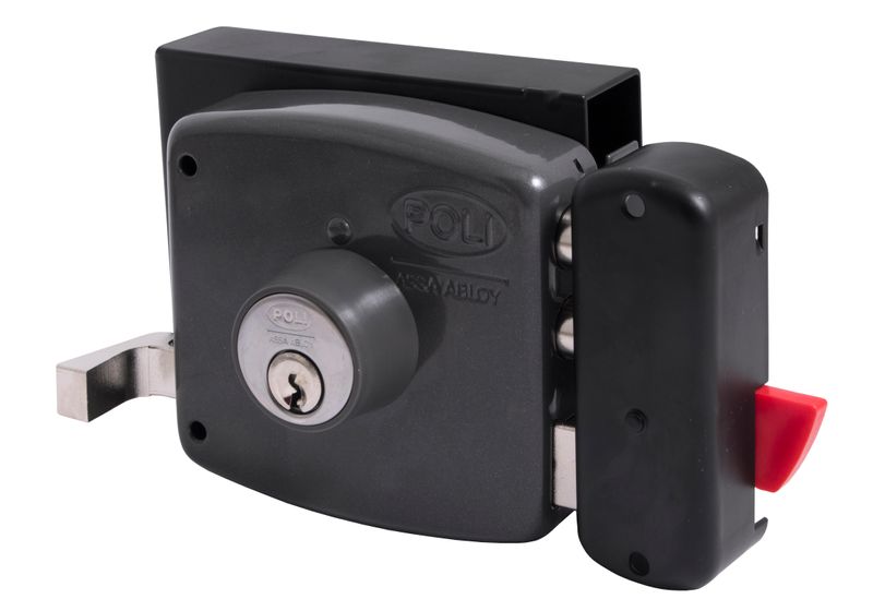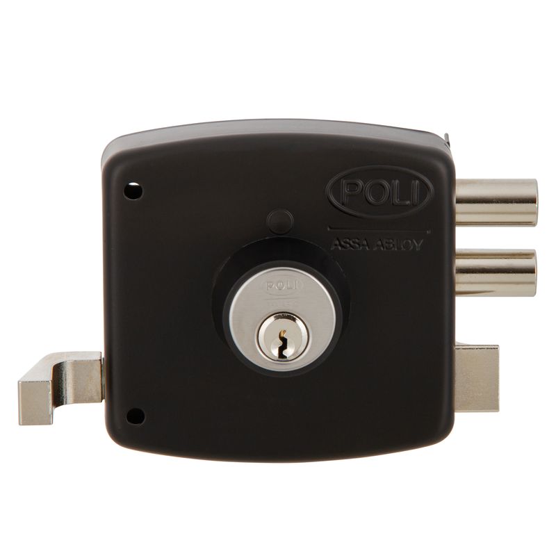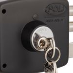 Cerradura de sobreponer mecánica Poli diseñada para uso en rejas, que incorpora sistema de bandera indicadora de puerta abierta y cerrojo de alta seguridad. Su construcción robusta permite un cierre confiable en accesos metálicos de uso residencial.