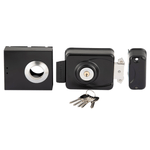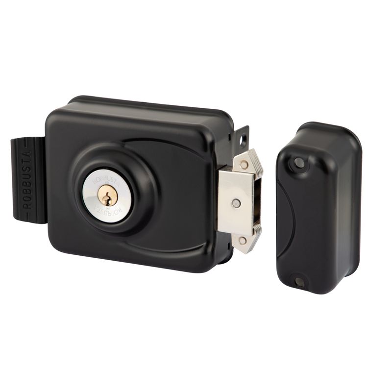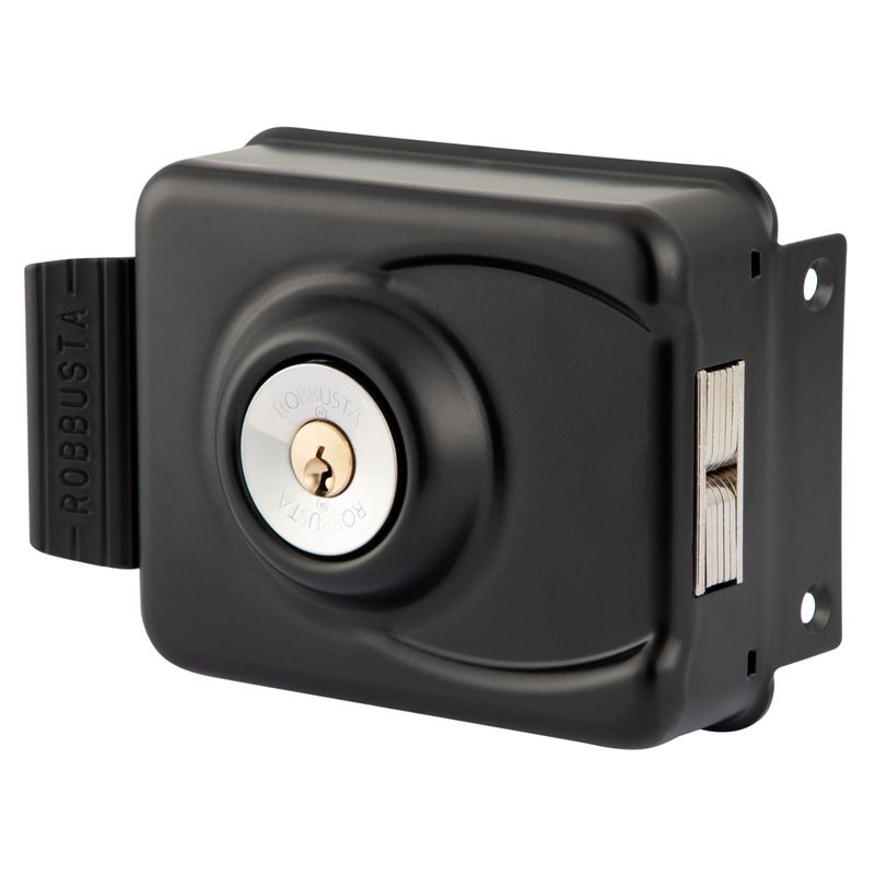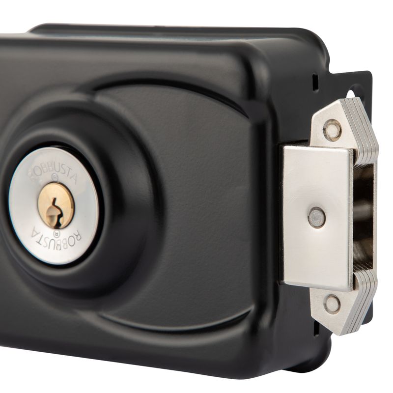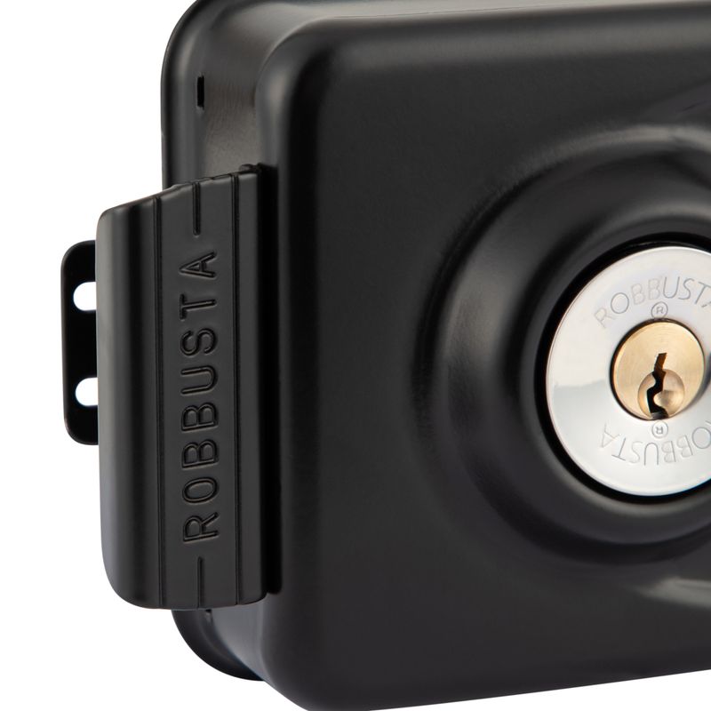 Cerradura de sobreponer mecánica Poli Robbusta 7300 diseñada para rejas y puertas correderas, orientada a aplicaciones de alta seguridad. Incorpora sistema antipalanca con cilindro protegido y diseño sin tornillos a la vista para un cierre más seguro y limpio.