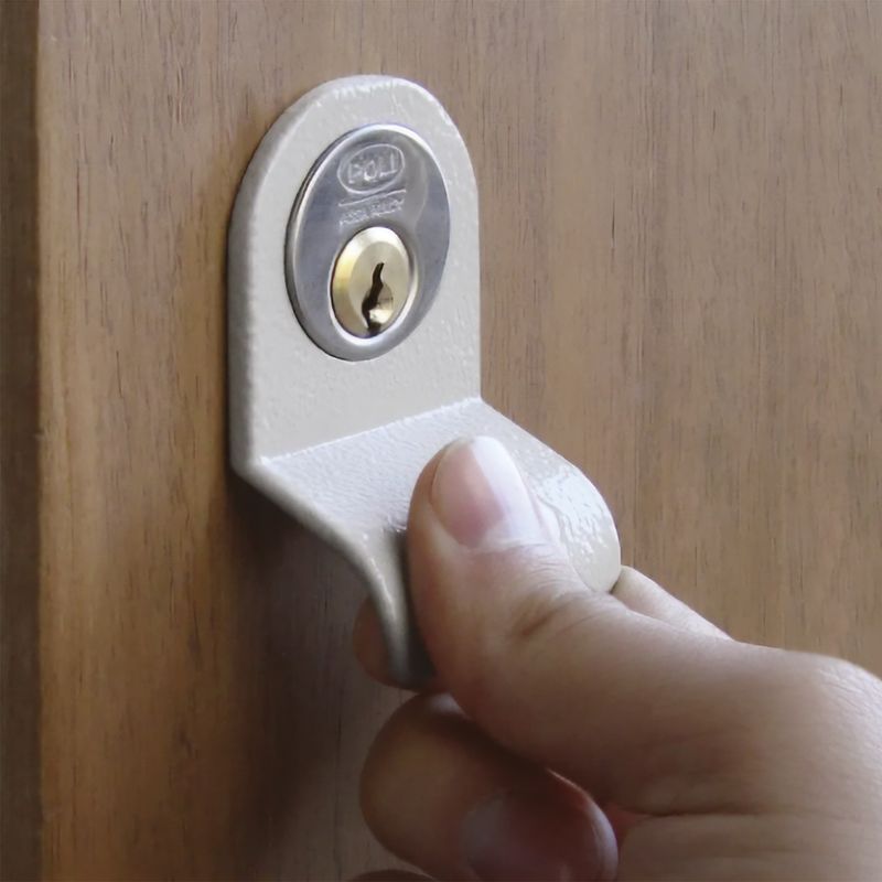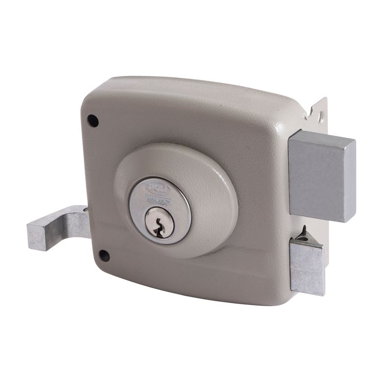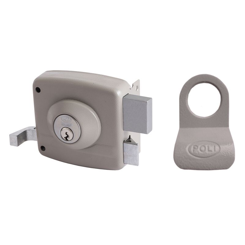 Cerradura de sobreponer tradicional Poli modelo 1974, diseñada para puertas de acceso que requieren un cierre firme y confiable. Incorpora cerrojo macizo y tirador exterior para un uso práctico en aplicaciones residenciales.