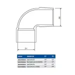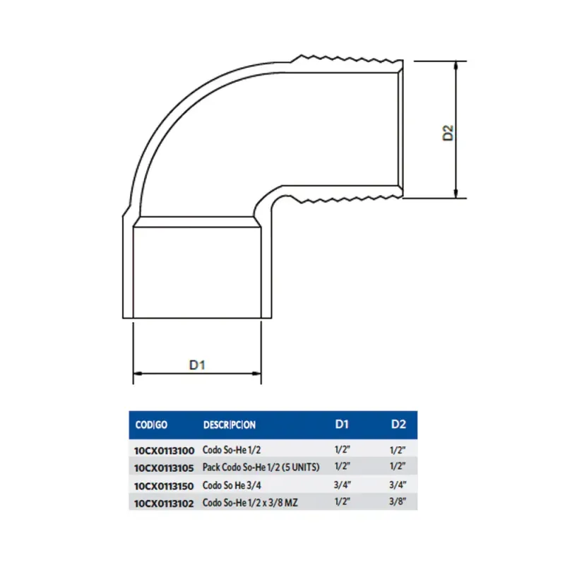 Codo de cobre para instalaciones de agua, diseñado para realizar cambios de dirección en ángulo de 90°, permitiendo la conexión entre una salida SO (soldar) y una rosca HE en sistemas sanitarios.
