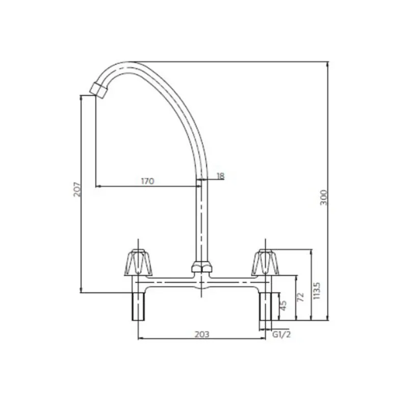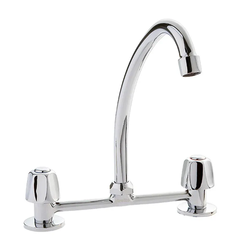 Combinación para lavaplatos de la línea New Isabella con distancia estándar de 8”, diseñada para instalación sobre cubierta. Fabricada en latón con terminación cromada, ofrece un funcionamiento tradicional y confiable para cocinas de uso doméstico.
