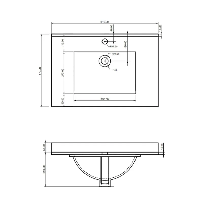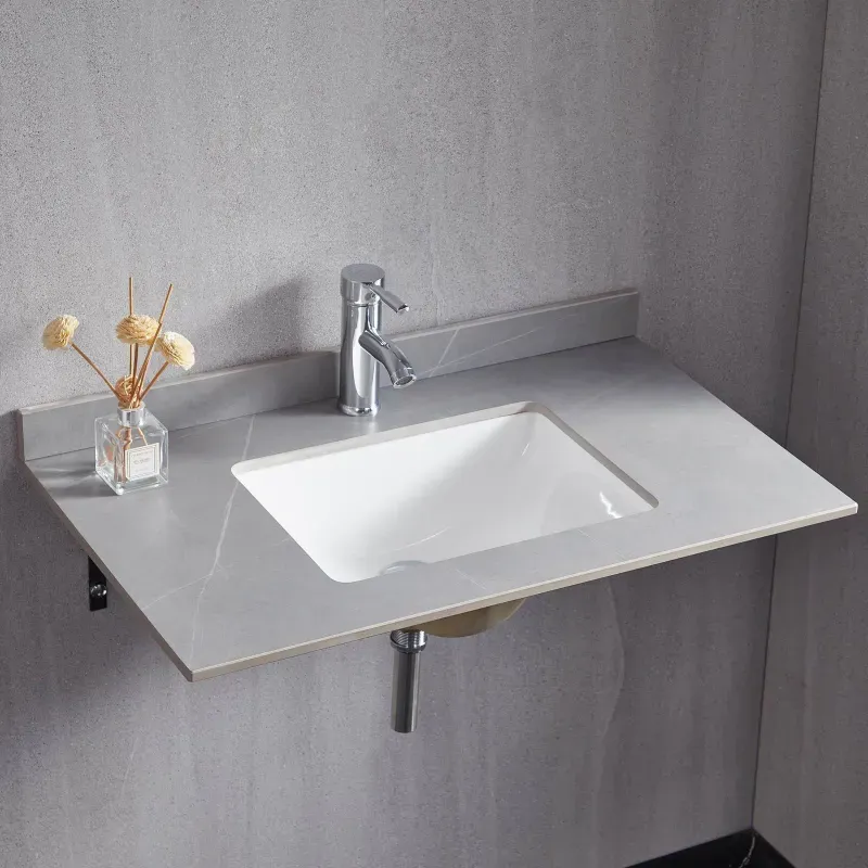 La cubierta de lavamanos Klipen Olivia Gris de 60 cm combina un top de porcelanato en tono gris con un lavamanos de cerámica vitrificada integrado, ofreciendo una solución compacta y moderna para baños residenciales.