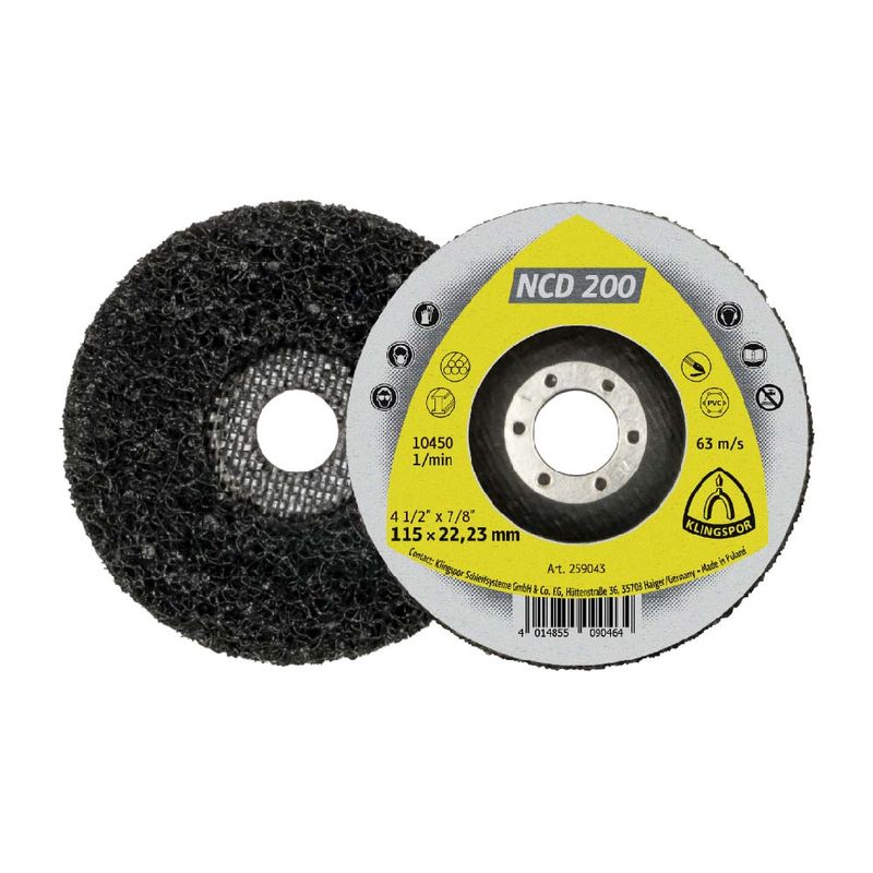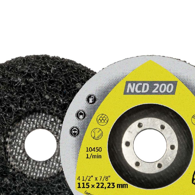 El disco de limpieza Klingspor NCD 200 de 115 mm de diámetro y orificio de 22,23 mm es ideal para limpieza agresiva y eliminación de óxido, pintura, barniz y residuos en acero, acero inoxidable, aluminio y plástico. Su fieltro no tejido con grano de carburo de silicio de estructura abierta evita obstrucciones y garantiza un rendimiento consistente.