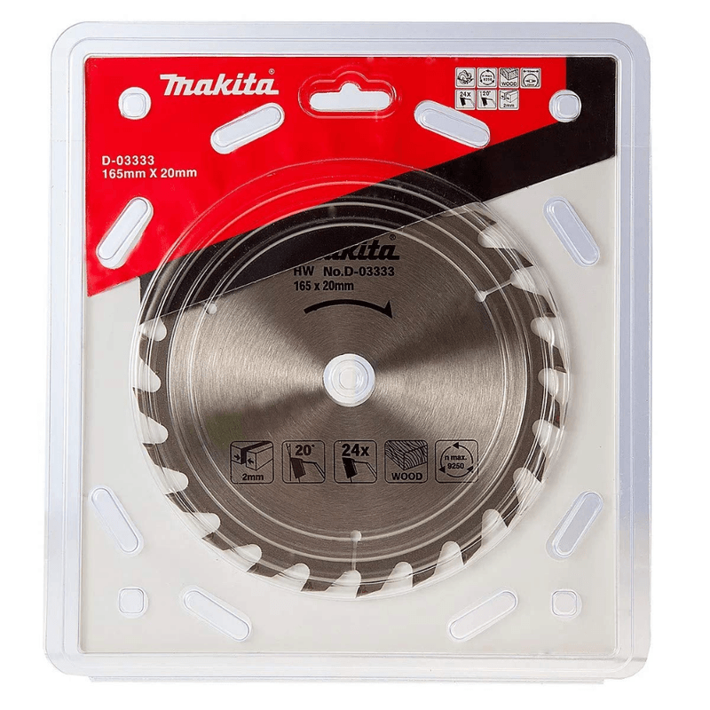Disco sierra circular Makita modelo D-03333, de 165 mm (6 ½″) de diámetro, sin buje, con 24 dientes en acero HSS con punta de carburo (TCT), ideal para cortes limpios y eficientes en madera.