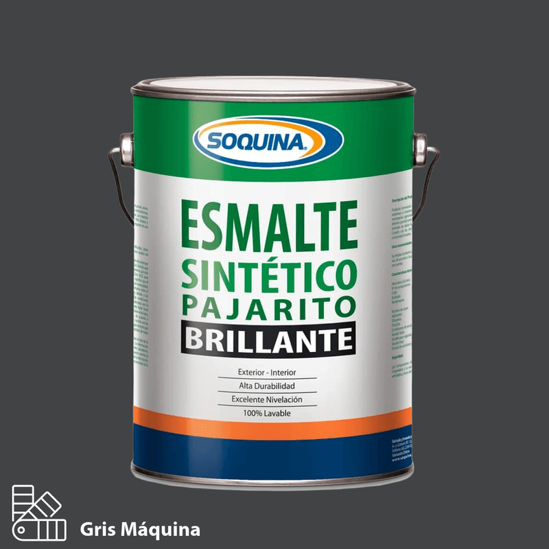 El Esmalte Sintético Pajarito Gris Máquina de Soquina, código 20009601, es una pintura de acabado brillante formulada con resinas alquídicas que brindan excelente adherencia, cubrimiento y durabilidad. Diseñada para proteger y decorar superficies de madera y metal en interiores o exteriores, ofreciendo una terminación uniforme y resistente.