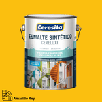 Esmalte Amarillo Rey Ceresita Cereluxe GL (código 10321101), pintura sintética de terminación brillante formulada para entregar un color intenso y duradero en interiores y exteriores. Ofrece gran poder cubriente, resistencia a la intemperie y un acabado uniforme que protege y decora superficies de madera, fierro y muros.