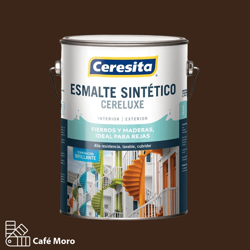 El producto 11521801 corresponde al esmalte Cereluxe Café Moro de la marca Ceresita, en presentación de 1 galón. Formulado con resinas alquídicas, este esmalte proporciona un acabado brillante, gran dureza y excelente poder cubridor en superficies interiores y exteriores.