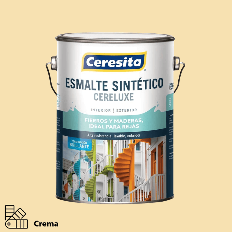 El Esmalte Sintético Cereluxe Ceresita Crema, código 10322201, es una pintura alquídica de alto brillo formulada para brindar excelente resistencia, adherencia y durabilidad. Su acabado brillante y de gran cubrimiento lo hace ideal para proteger y decorar superficies de madera y metal, tanto en interiores como en exteriores.