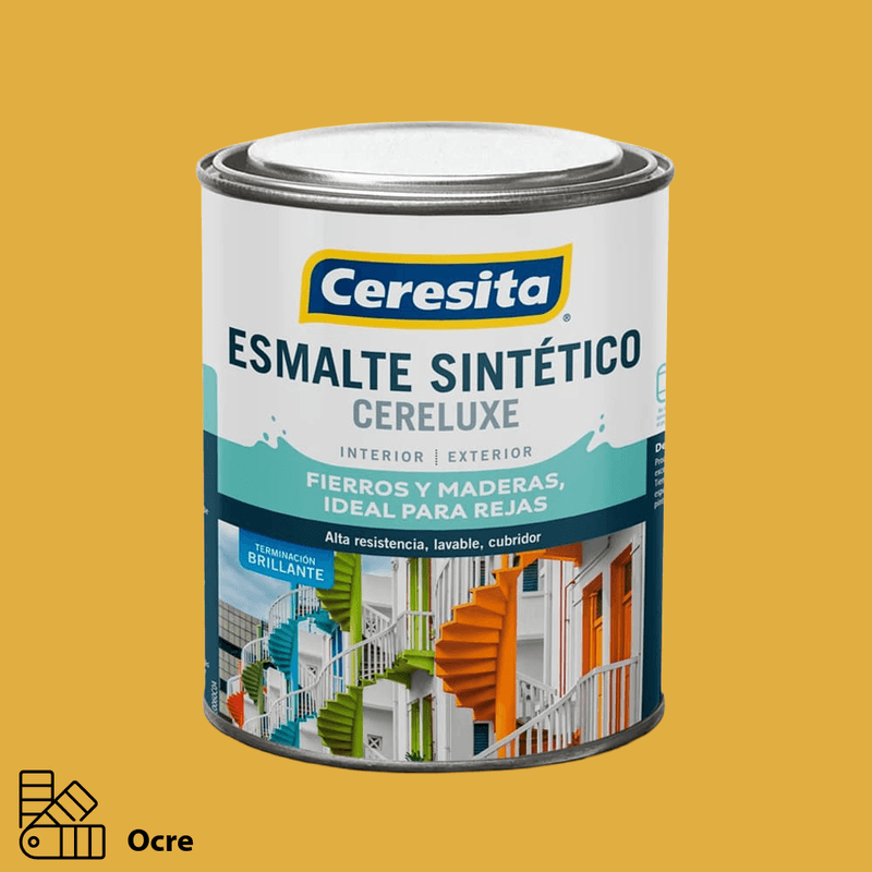 El producto 11414804 corresponde al esmalte Cereluxe Ocre de la marca Ceresita, en presentación de 1 litro. Este esmalte sintético está formulado con resinas alquídicas que entregan un acabado brillante, gran resistencia y excelente poder cubridor en superficies de madera y metal, tanto en interiores como en exteriores.