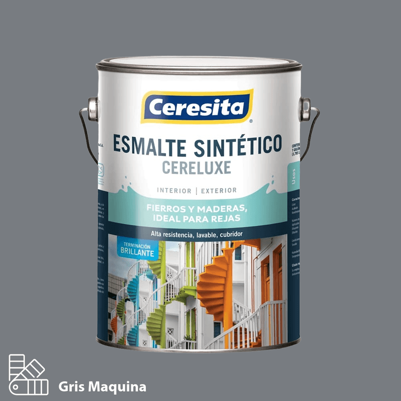 El producto 10382901 corresponde al esmalte Cereluxe Gris Máquina de la marca Ceresita, en presentación de 1 galón. Elaborado con resinas alquídicas, este esmalte sintético ofrece un acabado brillante, gran resistencia y excelente poder cubridor en superficies de madera y metal, tanto en interiores como en exteriores.