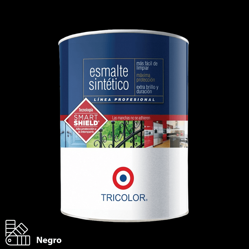 El esmalte sintético Tricolor en color Negro brinda un acabado brillante, uniforme y de alta resistencia, ideal para proteger y decorar superficies metálicas, de madera o yeso. Su formulación con resinas sintéticas de excelente calidad garantiza una adherencia superior, cubrimiento parejo y durabilidad prolongada tanto en interiores como en exteriores.