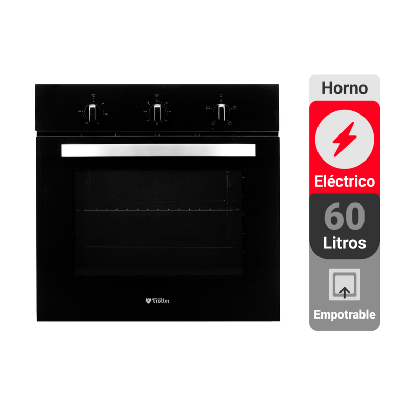 El horno eléctrico empotrable AT-XN E Kurz de Trotter ofrece 60 litros de capacidad y un diseño moderno con panel de vidrio negro. Sus 4 funciones de cocción y grill eléctrico permiten preparar diversas recetas con control preciso de temperatura.