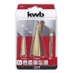 Juego profesional de brocas escalonadas KWB (Einhell), ideal para perforar diferentes materiales sin cambiar de herramienta. Incluye dos brocas escalonadas y una broca-fresa, todo fabricado en acero HSS con superficie de titanio nitrurado para mayor durabilidad y acabados limpios.