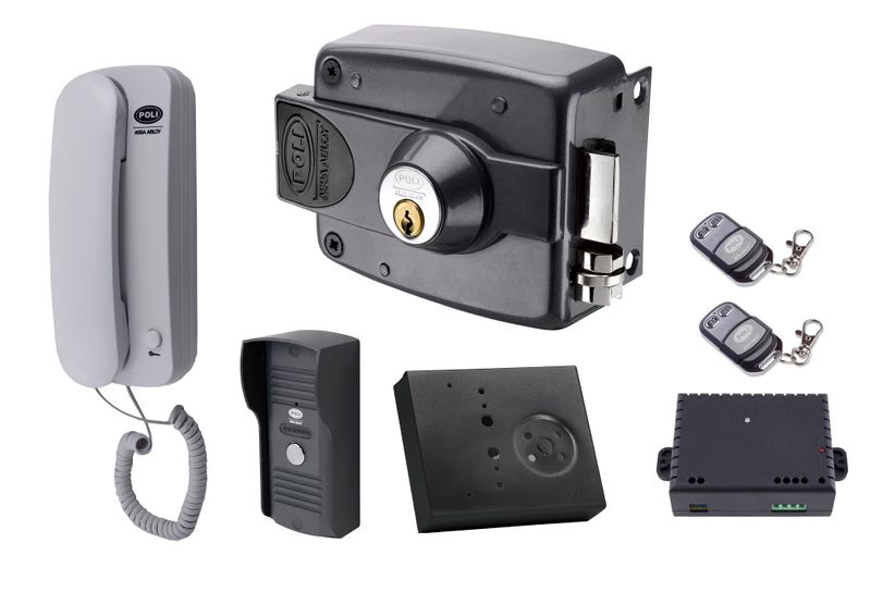 - Configuración: Cerradura eléctrica de sobreponer + portero (citófono) + control remoto