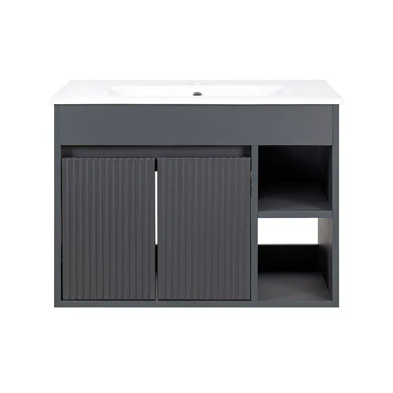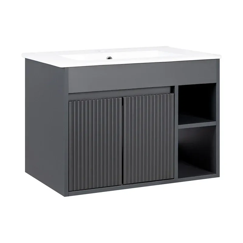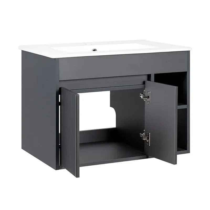 Kit de mueble de baño suspendido con vanitorio de la línea Lille, que combina un diseño contemporáneo sin manillas con puertas texturadas y repisas interiores para una organización eficiente del espacio.