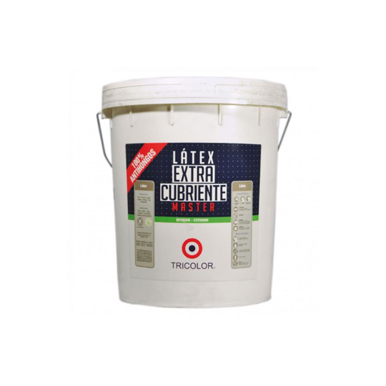 Látex Master Tricolor Base A en formato tineta, pintura arquitectónica base agua formulada para protección y terminación de muros y cielos en interior y exterior.