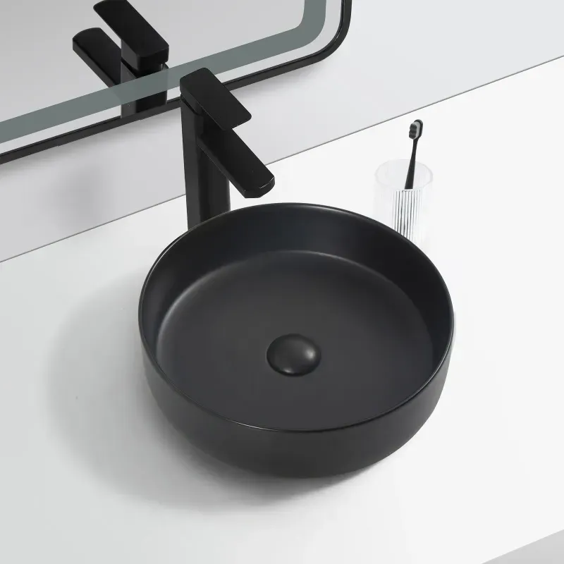 El lavamanos de sobreponer Dream Black redondo, código LAV-01-0292, ofrece un diseño moderno en acabado negro mate, ideal para baños que buscan una estética elegante y minimalista.