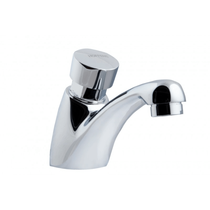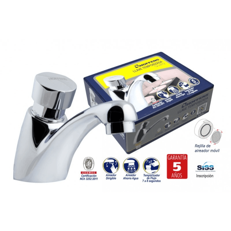 La llave temporizada para lavatorios Hoffens, línea Quality (Referencia 65002), permite un control automatizado del flujo de agua con cierre tras 7 a 8 segundos, ideal para optimizar el consumo y mantener estándares sanitarios.