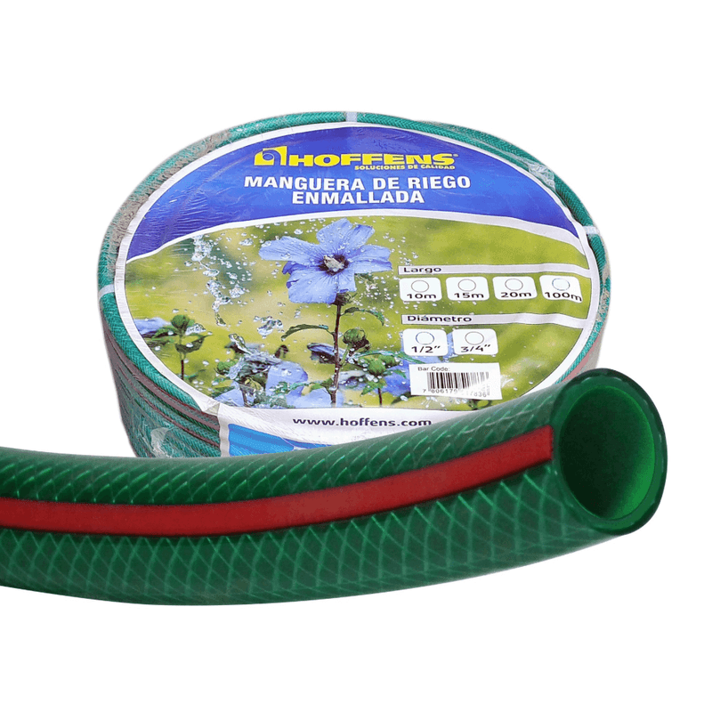 La manguera Mallaflex Hoffens de 3/4" (referencia 51784) está fabricada en PVC flexible y reforzada con una malla de poliéster, lo que le otorga resistencia a presiones medias y previene roturas. Su diseño verde con línea roja la hace ideal para aplicaciones de riego en jardines y uso doméstico intensivo.