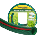 La manguera Mallaflex Hoffens de 1/2" x 15 metros, en color verde, está diseñada para uso doméstico y de jardín. Su construcción en PVC flexible con refuerzo enmallado proporciona resistencia a la presión, durabilidad y un flujo constante de agua en tareas de riego y limpieza.