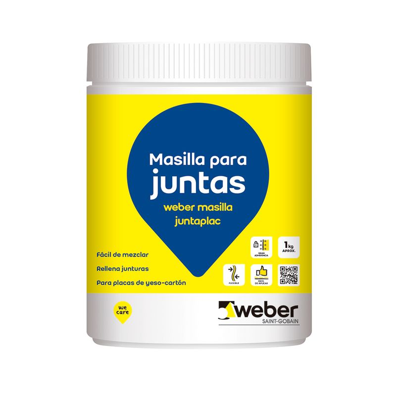 Masilla para Juntas (Juntaplac) Pote 1 Kg Weber código QUI098 es un compuesto en pasta de color blanco, de alta adherencia y consistencia plástica, diseñado para trabajos de junturas y reparaciones en sistemas de tabiquería. Permite un manejo controlado y una aplicación uniforme, logrando superficies listas para su terminación final.