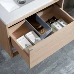 El mueble de baño Klipen “Queen” con cajón y repisa ofrece una solución moderna y funcional para espacios compactos, integrando un lavamanos de loza vitrificada y un diseño suspendido que optimiza el área disponible.