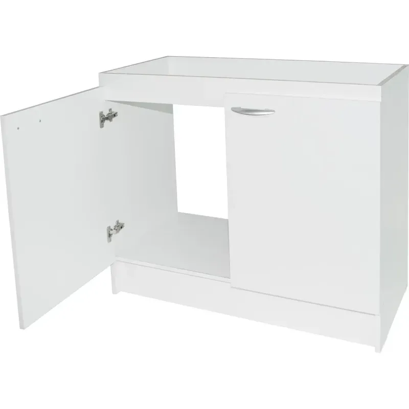 El mueble base de lavaplatos de 80 cm está fabricado en melamina color blanco, con un diseño compacto y funcional para cocinas de menor tamaño. Cuenta con dos puertas que facilitan el acceso al espacio interior, ideal para almacenamiento y organización bajo el lavaplatos.