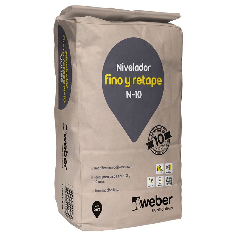 Nivelador Fino y Retape N-10 Weber es un mortero cementicio predosificado para nivelaciones de bajo espesor y trabajos de retape en pisos interiores y exteriores. Permite preparar superficies antes de la instalación de revestimientos, logrando una terminación fina y uniforme. Presentación en saco de 25 kg, código QUI188.
