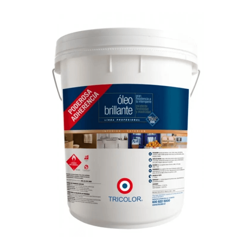 El óleo brillante Tricolor en color Blanco ofrece un acabado luminoso, uniforme y duradero, ideal para proteger y decorar superficies metálicas, de madera o yeso. Su formulación con resinas alquídicas de alta calidad y pigmentos seleccionados garantiza excelente adherencia, cubrimiento parejo y una prolongada resistencia a la intemperie, tanto en interiores como en exteriores.