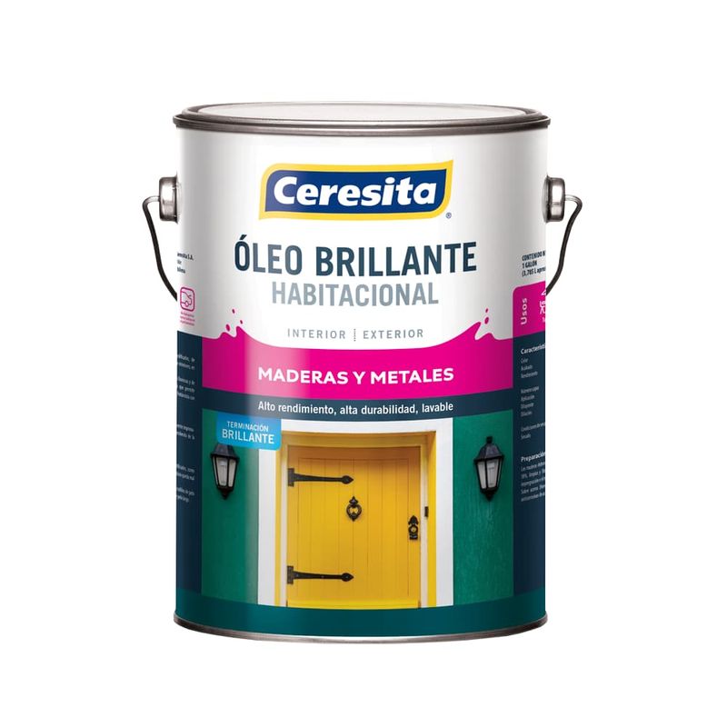Óleo habitacional en acabado brillante color blanco de la marca Ceresita, correspondiente al código 10826601. Su formulación con resinas alquídicas modificadas y aceites brinda gran poder cubridor y resistencia tanto en interiores como exteriores, especialmente en maderas y superficies metálicas previamente imprimadas.