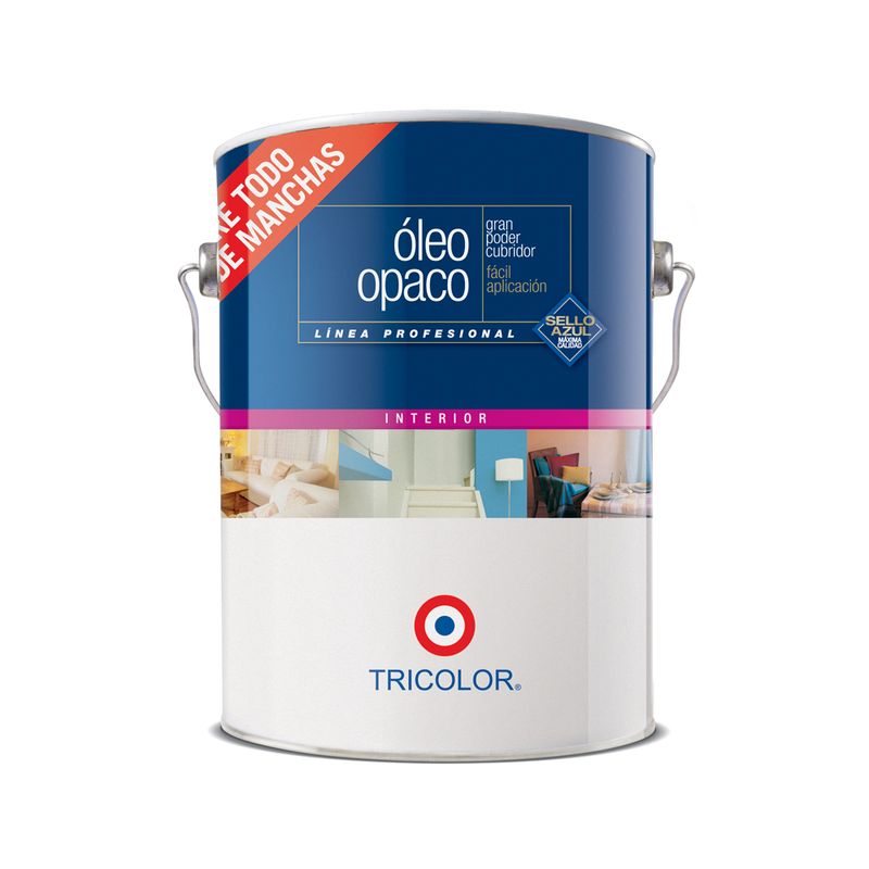 Óleo opaco Tricolor Base A en formato galón, pintura sintética de línea profesional formulada para acabados resistentes y uniformes en superficies interiores.