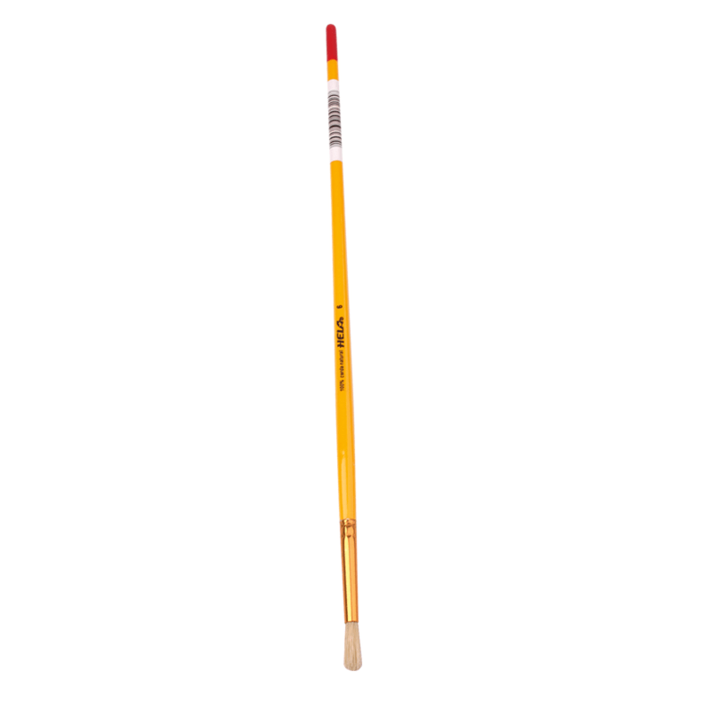 Pincel redondo profesional HELA N° 6, diseñado para una aplicación precisa y continua de pintura. Incorpora cerda natural blanca 100%, virola niquelada redonda y puntas rectas naturales que favorecen un acabado prolijo. El mango de madera pintado amarillo con extremo rojo proporciona firmeza durante el uso.