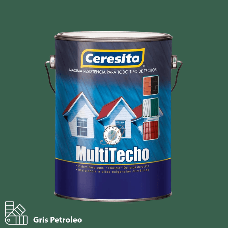 Pintura para techos Ceresita Multitecho color Gris Petróleo, código 11370401, en presentación de 1 galón (GL). Formulada con resinas acrílicas en base agua que entregan excelente adherencia y protección frente a la intemperie, ideal para superficies como techos de fibrocemento, galvanizados o metálicos.