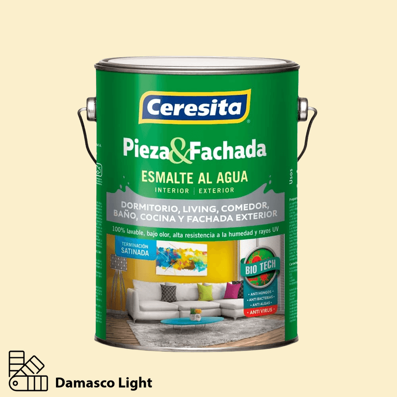 Esmalte al Agua Pieza y Fachada Damasco Light en galón (código 11434801) de Ceresita es un esmalte semibrillante para interiores y exteriores. Su fórmula Biotech protege contra hongos, algas y bacterias, entregando un acabado lavable y resistente que mantiene las superficies en óptimas condiciones por más tiempo.